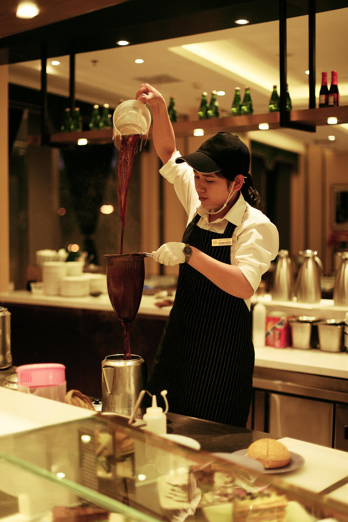 拉茶姑娘在熟练切着手中的多米诺黄油